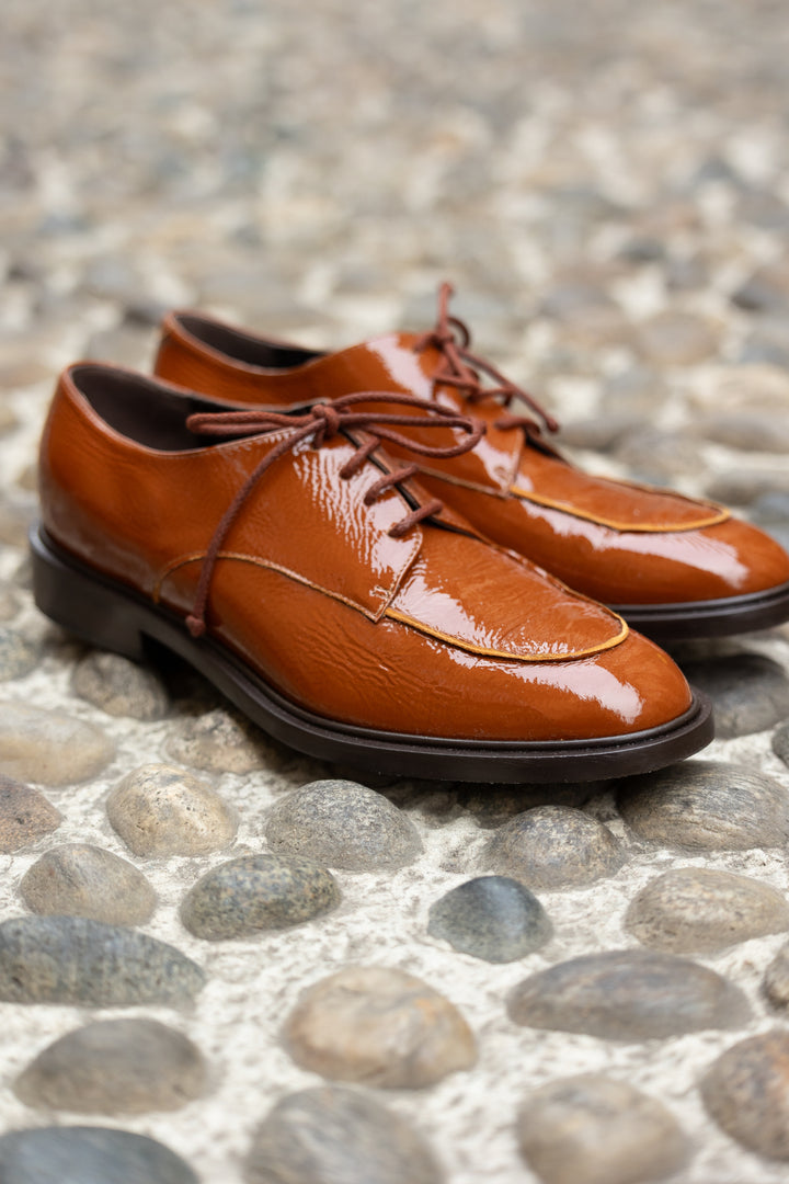 The Riflesso model is crafted from crinkled patent leather (pelle verniciata effetto stropicciato) in the refined Whisky shade.